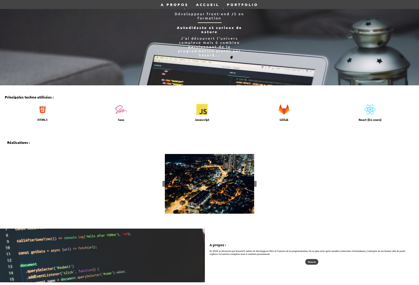 Concernant mon 1er gros projets perso et bien... Vous naviguez dessus. Ce site condense ma formation de base en HTML, Sass et JS. Il recevra évidememnt des améliorations de design et par la suite en fonction de mes nouvelles compétences.